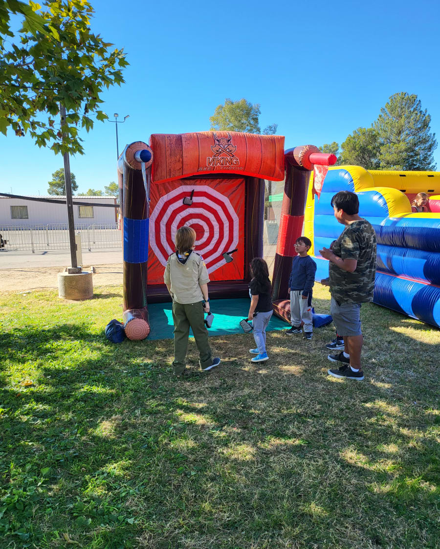 Bring excitement and laughter to your next event with our Throwing Axe Game! Perfect for kids of all ages, this inflatable game guarantees hours of safe and thrilling fun. With its foam, vinyl, Velcro, and plastic axes, there's no need to worry about sharp objects. Whether you're hosting a birthday party, school event, or church gathering, our throwing axe game rental is the perfect addition.