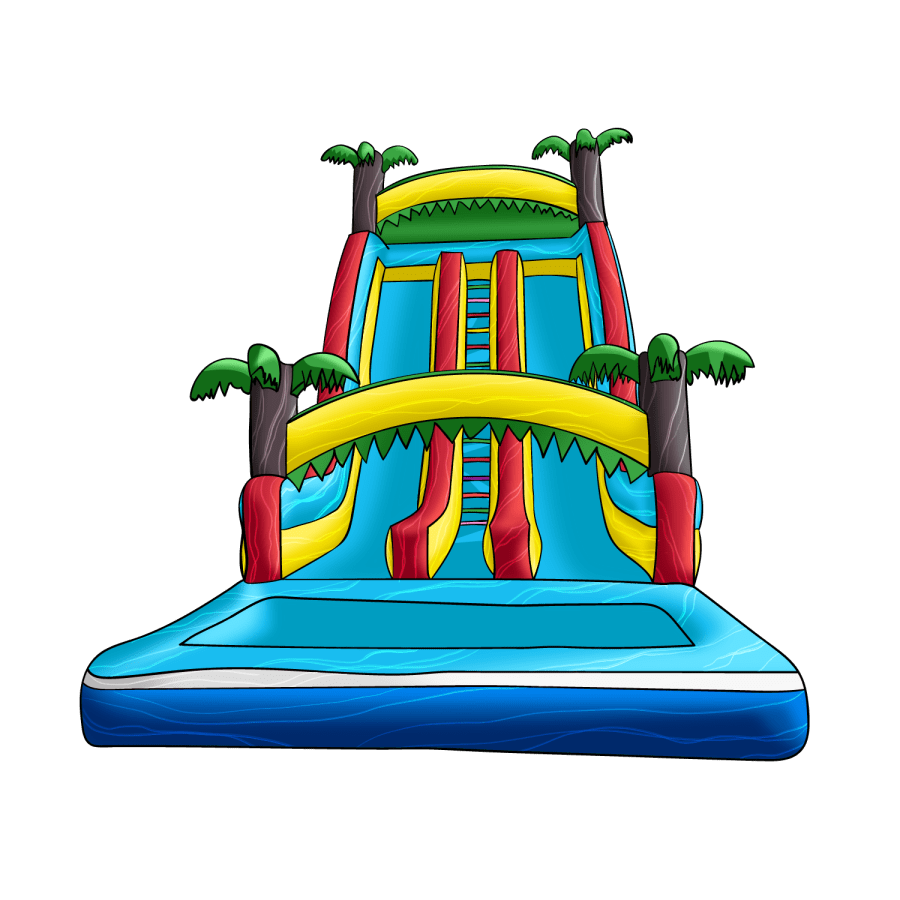 Are you ready to elevate your party fun to new heights? Our 24ft Tropical Water Slide rental is the ultimate crowd-pleaser! Featuring a vibrant, tropical theme complete with four towering palm trees, this dual-lane slide brings the excitement of a Hawaiian luau right to your backyard. Perfect for kids aged 5 and older, as well as teens and adults, this versatile slide can be used wet or dry, making it a fantastic choice for any event.